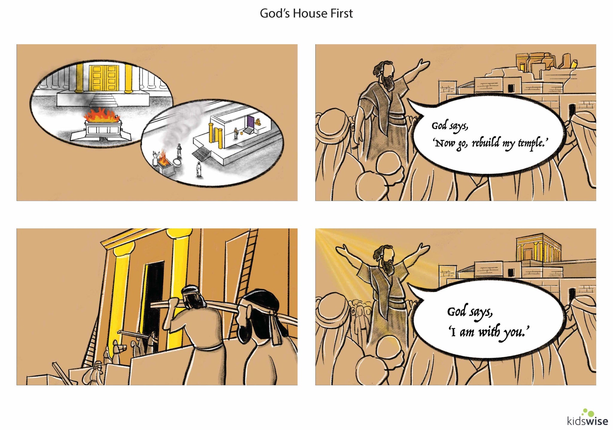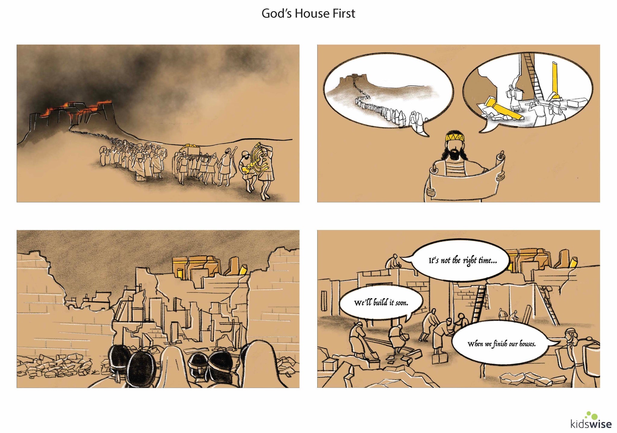 In the opening chapter, God calls his people to: ‘Give careful thought to your ways.’ (Haggai 1:5) The temple was where sacrifice for sins could be made. The temple was where God promised to meet with his people. For seventy years there had been no temple. God’s people had returned to their land and had prioritised the building of their homes over the rebuilding of God's house, the temple. ‘Is it a time for you yourselves to be living in your paneled houses, while this house remains a ruin?’ (Haggai 1:3-4) In Haggai 1:12-15 and Ezra chapter 5, we see the obedient response of the people to God’s call and they begin to prioritise God and the rebuilding of his temple. Because of Jesus. we no longer need a temple. Jesus is the perfect sacrifice for our sin and because of Jesus God lives in us by his Spirit. So now we can seek God first and the building of his kingdom by sharing the good news about Jesus.